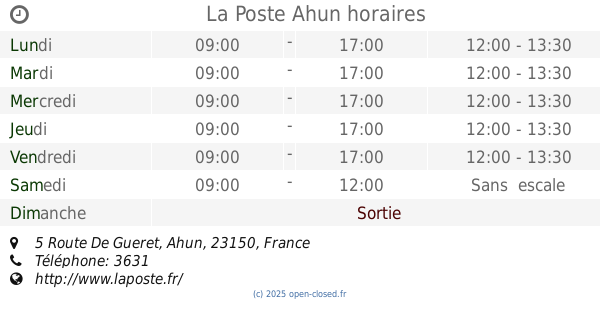 Add it to your website, your phone or even your desktop - opening times, phone numbers and the road to Branche of the La Poste Dans Ahun, 5 Route De Gueret.